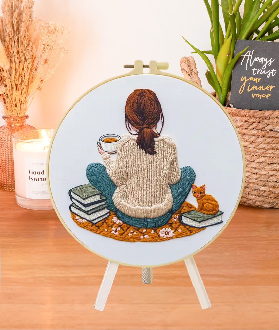 Onze borduurscènes zijn dubbel me-time. Het borduren zelf brengt je tot rust, terwijl de ontwerpen stuk voor stuk momenten van verstilling en ontspanning verbeelden. Met elke steek groeit er iets dat zowel een creatief proces als een ode aan traagheid en genieten is. Alles zit in één stijlvolle DIY-box: fijne materialen, duidelijke instructies en de luxe om even niets te moeten.